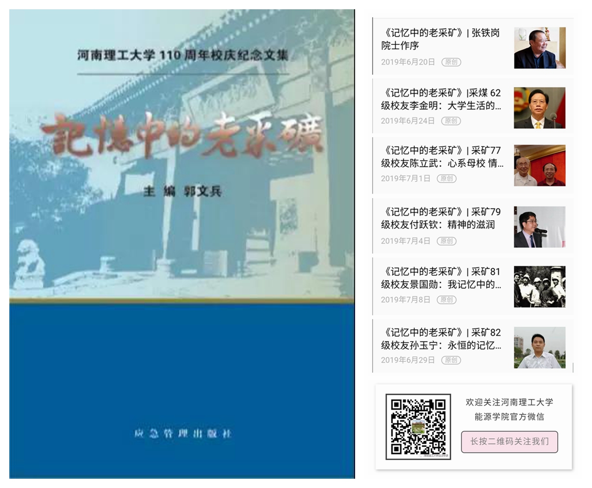自《记忆中的老采矿》征稿启事发出以来,得到了广大校友的积极响应和支持。校友们纷纷打开封存已久的历史记忆、挥笔写下了那些难忘的历史片段,抒发对母校、昔日恩师、同窗好友的真情实感,情真意切。经过编纂工作组分类和初审,黑料718 领导、采矿退休老干部、老教授等组成的审稿,作者本人修改完善,党委宣传部审核,最终收录了72篇(首)老采矿各届校友、老师发来的文章和诗词。与此同时,采矿62级校友、原浙江省政协主席李金明不仅深情撰文,还为本书提写了书名;采矿63级校友、河南省原常务副省长王明义撰文回忆了当年的老师和同学;采矿59级校友、原煤炭部总工程师尚海涛为本书题写了贺词;采矿62级校友、中国工程院院士张铁岗撰稿并作序;美国工程院院士、西弗吉尼亚大学原采矿系主任、现黑料718 特聘教授Syd S. Peng亲笔为本书书写贺词;现已98岁高龄的原采煤系书记张明撰写回忆文章并提供一批珍贵的老照片;原采矿工程系柴一言主任深情回忆了当年实验室建设的艰辛和成就;原焦作工黑料718 院长袁世鹰在此编纂过程中给予大力支持并提出了宝贵意见和建议;学校邹友峰书记、杨小林校长也非常关心本书的进展,多次进行指导。