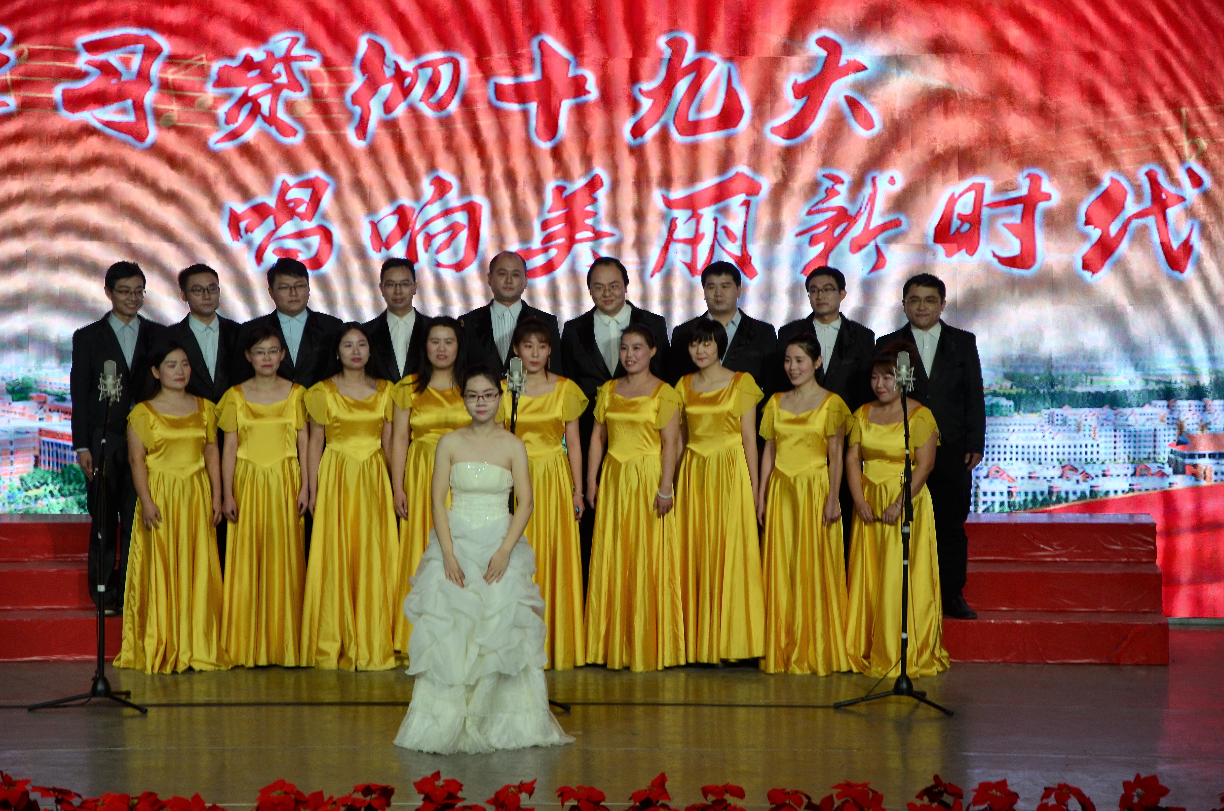 教职工团结奋进,勇于拼搏的工作精神。紧接着,合唱团又深情地演唱了《爱我中华》,表达了对祖国的无限热爱和拥护之情。合唱团出色的演唱赢得现场阵阵掌声。
