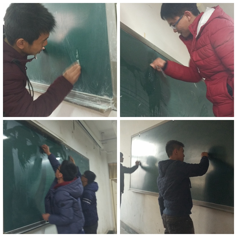 清理活动开始之前,党支部成员每人分得一块橡皮和一条抹布。在负责人的带领下分成五组,每组负责一个楼层的黑板清理。大家轻手轻脚有序地擦黑板,尽量不影响到还在教室里正在自习的其他同学,大家发扬不怕脏,不怕累的精神,热情高涨。在大家不懈的努力下,经过一个多小时的清理,院楼的黑板焕然一新。