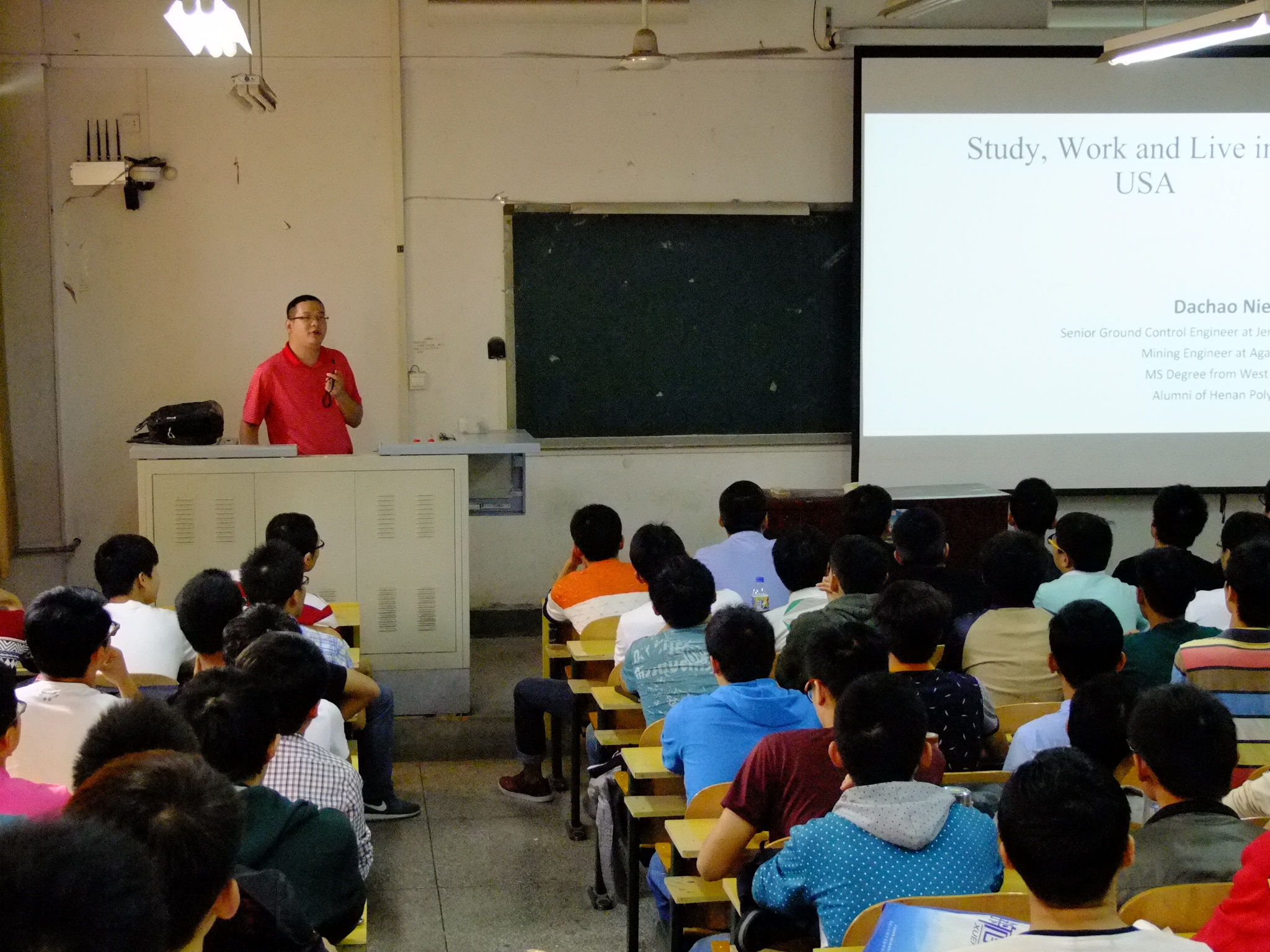 院楼202教室开展了题为“Study,Work and Live in the USA"的学术讲座。我院副教授张盛、副教授魏锦平、副教授韦四江,部分研究生,12级采矿卓越班全体同学及13级、14级学生代表参加了本次讲座。讲座由张盛主持。
