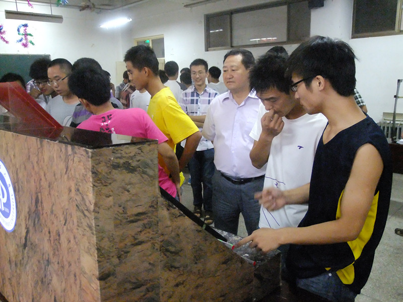 考察中,勾攀峰教授对采矿实践作品的工作性能、工作原理、任务进度等方面进行了询问,认真聆听了学生有关机械工作原理、操作步骤的报告和回答。他对于参赛人员对于专业知识水平的掌握和运用表示非常满意,对于他们熟练的操作和有条不紊的回答很是赞赏,他说,采矿作品实践大赛是学生锻炼自己的舞台,值得大家高度重视和关注,要好好把握这次机会,在自己所学的知识和实践之间建立良好的联系,这对于将来学习和工作都具有极大的促进作用。他还强调,采矿实践作品大赛逐渐接近,大家要保持良好的精神状态,加强与队员之间的交流,努力对作品提出更高的要求,并在此基础上做出合理的改进。