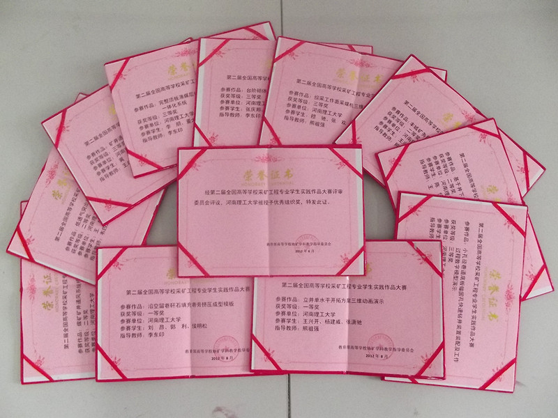 继我校在2010年首届采矿实践作品大赛中取得优异成绩之后,今年喜讯再度传来,在第二届大赛中,我校成绩喜人。采矿工程专业选送的11件优秀作品在来自全国21所高校采矿工程专业学生提交的150多件实践作品之中脱颖而出,取得了优异的成绩。