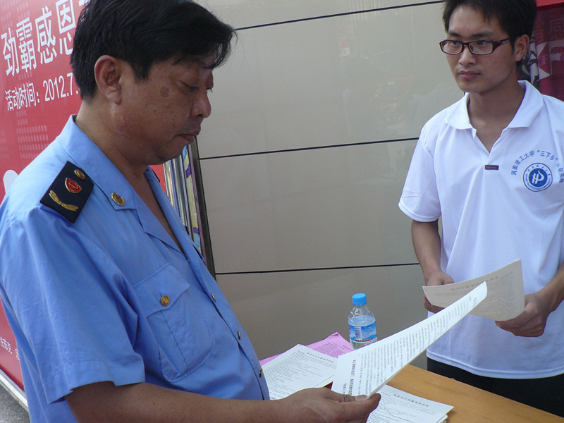在消保科李科长的带领下,队员们分别到不同的部门了解情况。首先,队员们根据自己知道的辨别假冒伪劣产品的方法咨询了其准确性,并让专业人员详细介绍更准确的方法,为后面向广大群众的宣传活动打下了基础。随后,队员们就国家颁布的《国务院关于加强食品安全工作决定公布》的施行情况进行了询问,了解到工商局早已建立六项机制狠抓食品安全工作,一直进行着食品添加剂生产环节专项检查,都取得了良好的效果,他们在下以后的工作中将坚持“三个严把 四个强化”加强流通环节食品安全监管,努力为群众打造一个良好的食品市场。队员们也取得了食品安全投诉电话和投诉方式,向工作人员表明在他们的食品安全工作中会号召广大群众进行监督。最后,队员们请求李科长给予一些证明,以便更为顺利的开展后续的超市食品调查。李科长欣然同意并说:“看来,你们此次活动有着详细的计划,一定付出不少的努力,感谢你们能如此支持我们的工作,希望下一步工作进行的顺利。”队员们坚定的说:“保证一定会更努力开展后面的工作,为群众带去全面的食品信息。”