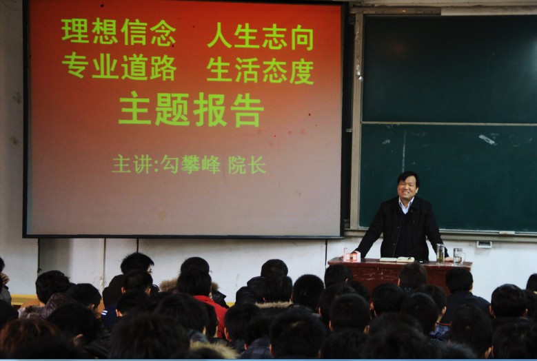 楼104会议室,勾攀峰院长在新学期伊始给11级采矿学生做了“理想信念、人生志向、专业道路、生活态度”主题报告。该院党委副书记浮新平出席以及各级辅导员参加了本次报告会。