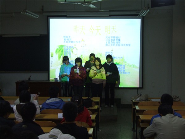 活动伊始,主持人向大家介绍了本次团组织活动的主要目的,并宣读了本次活动中的注意事项。活动在婉转动听的背景乐《阳光总在风雨后》中正式开始,此次活动采取自由上台发言的模式,活动内容共分四个部分:一、怀念难忘的高中生活;二、初进大学的感触;三、如何规划大学的生活;四、展望未来的人生。活动中,富有诗意的诗歌朗诵,振奋人心的激情演讲,柔美微妙的二人对唱,把活动会场的气氛推向了高潮,同学们积极上台发言,说出了大学新生活的感受和对大学四年的生活规划。最后,活动在《一个人的寂寞,两个人的错》的歌声中落下了帷幕。