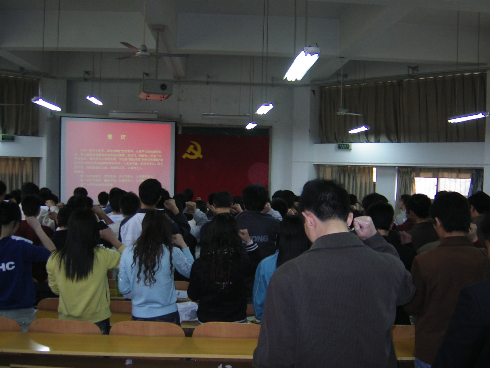 200多名学生党员在104多媒体教室面对国旗进行庄严宣誓,标志全院学生党员“讲正气,树诚信新风”系列活动拉开了帷幕。
