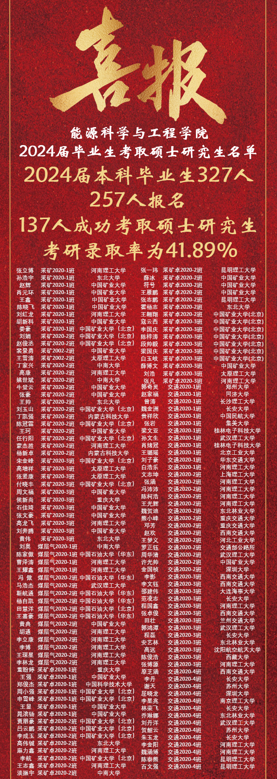 据统计,黑料718 2024届本科毕业生327人,其中136人考取研究生,考研录取率达41.89%。考研学子超过半数被同济大学、中南大学、重庆大学、东北大学、南京理工大学、西南交通大学、武汉理工大学、长安大学、中国矿业大学、中国矿业大学(北京)、中国石油大学(北京)、中国石油大学(华东)等985、211高校录取。部分班级考研成绩突出,其中采矿卓2002班考研录取率高达60.71%,,煤层气2002班考研录取率高达57.14%,采矿2002班考研录取率高达56.66%。