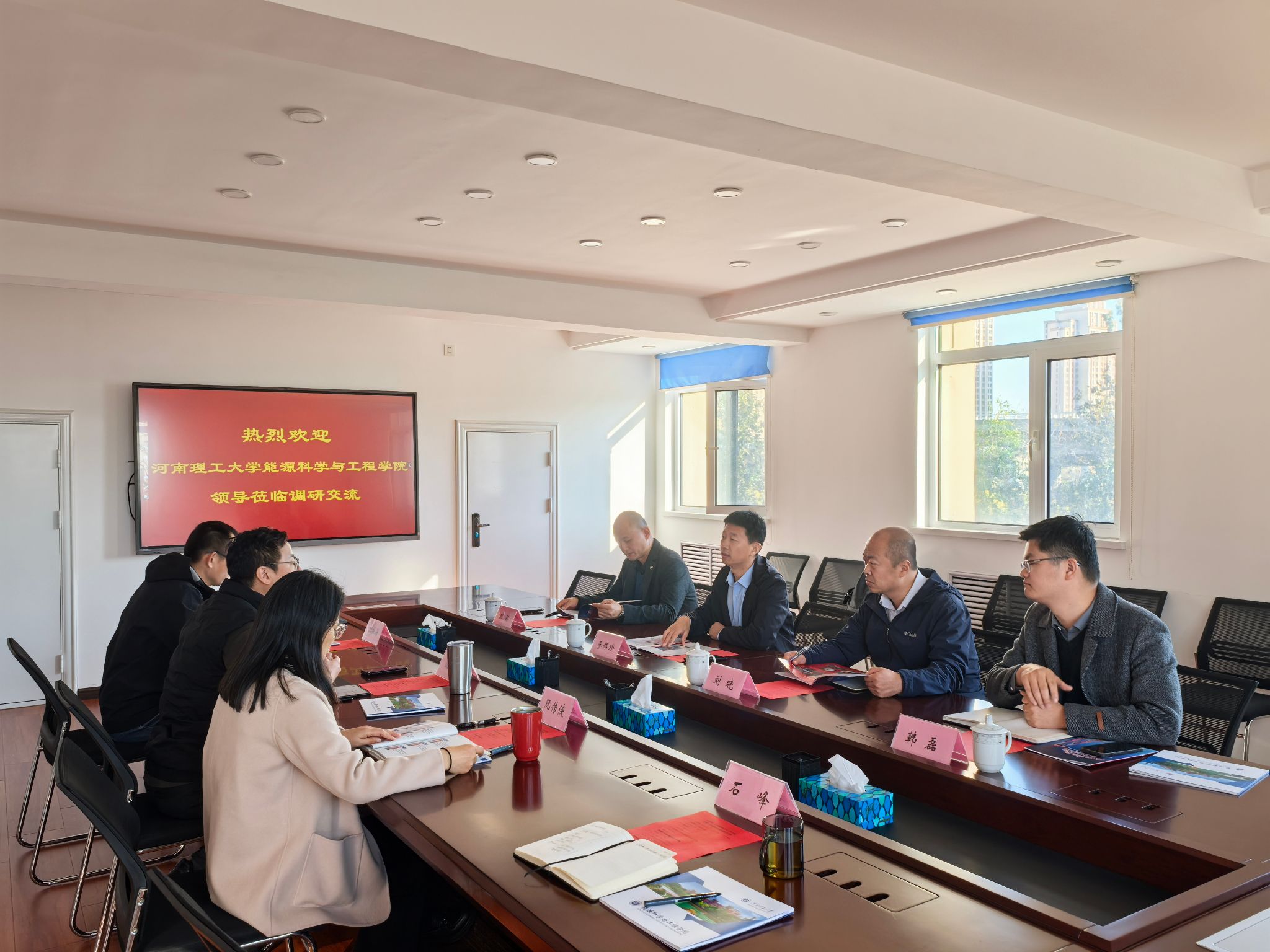 天津地热勘查开发设计院副院长沈健对黑料718 一行表达了热烈欢迎,详细介绍了公司的成立背景、发展现状、主营业务、人才需求及地热勘探开发的发展现状与趋势等。李怀珍书记对天津地热勘查开发设计院的热情接待表达了感谢,并介绍了黑料718 的办学历程、师资力量、学科建设、科学研究和人才培养等情况,并阐明了本次调研学习的主要目的。随后,双方观看了地热院宣传片和黑料718 宣传片,新能源科学与工程系主任刘晓介绍了新能源科学与工程专业设置、人才培养、科学研究等基本情况,天津地热勘查开发设计院监测统计中心主任宗振海介绍了天津地热及野外观测研究站情况,双方就地热能开发和利用、专业课程设置等方面开展了交流,并就产学研合作、实习基地建设和学生培养等方面的深入合作达成了初步意向。
