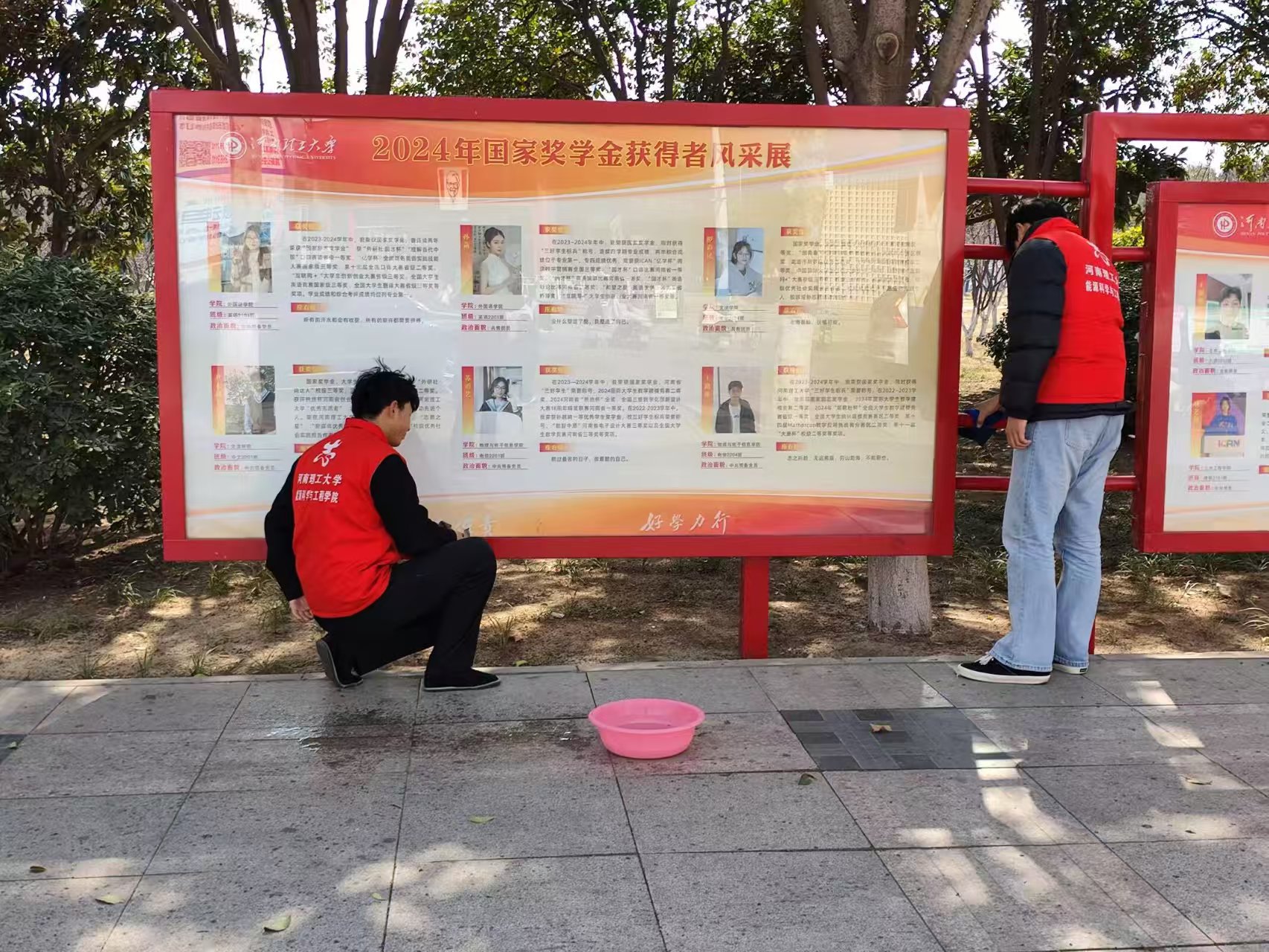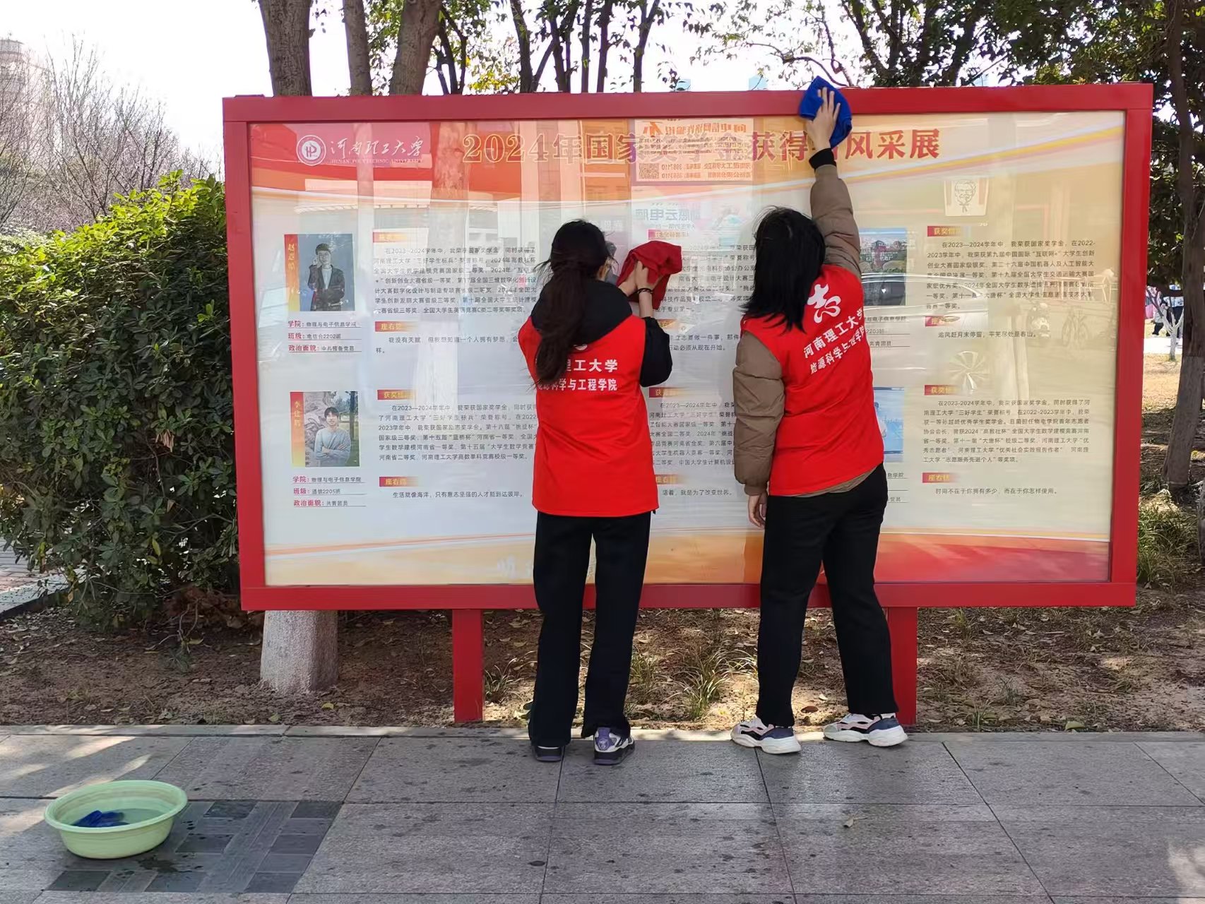 晨光微熹中,佩戴着志愿者袖章的身影已忙碌在文化长廊。同学们三人成组、五人成队,手持专业清洁工具展开立体化作业:高个子男生攀上梯架清理廊檐浮尘,细心的女生半蹲着用棉签剔除栏杆雕花纹饰里的积垢。经过两个多小时的精细化作业,12座报刊展示柜重现透亮光泽,26块文化展板图文清晰可辨,连廊木质座椅的纹理都透出温润本色。志愿者们还特别设置"文明贴士"互动角,将清洁过程中发现的易积尘死角绘制成示意图,供师生扫码获取日常维护指南。