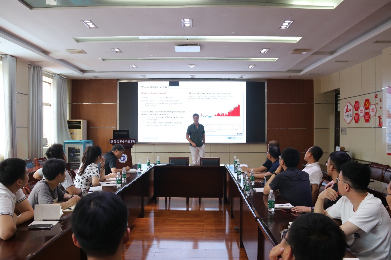 报告会一开场,Klitzsch博士以风趣幽默的方式做了详细的自我介绍,并对欧洲顶尖理工大学-亚琛工业大学的办学历史、机构设置、科研实力、校园环境等做了一一介绍。为了让听众理解为何要开发利用地热能,他引用详细数据说明了全球气候变化的特征、气候变化的危害以及地热能相较于传统化石能源的诸多优势。接下来,他讲解了地热能的来源、地热能的利用方式、热泵的工作原理以及浅层地热系统的分类。为了更好地说明地热能在智慧城市建设中的巨大作用,Klitzsch博士介绍了他主持的德国联邦经济事务与能源部项目“利用模型预测控制在楼宇自动化系统中集成钻孔换热器”。最后,他与在场师生就报告内容以及出国留学和访问相关问题做了深入的交流。本次讲座内容新颖,报告人思路清晰、娓娓道来,现场气氛热烈,激发了学生们与外国学者进行学术和文化交流的热情。