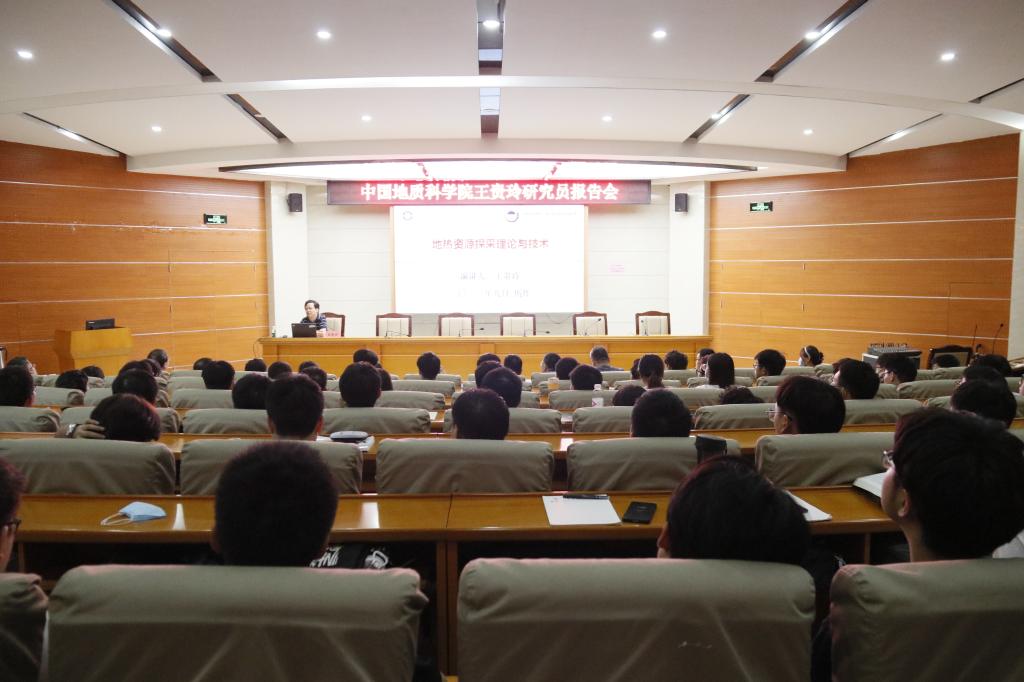 王院士首先介绍了我国以碳达峰、碳中和能源供给领域的重大变革以及新能源的发展趋势,指出探索深化地热能开发,可为实现“双碳”目标提供重要保障。接着,王院士用通俗、幽默的语言,结合工作实际,以讲故事的形式循序渐进的就“地热资源的成因”、“地热资源探测技术”、“地热资源评价技术”、“地热资源勘查进展突破”、“地热资源开采利用技术”、“未来的主要工作”等进行了系统介绍。最后王院士热情的回答了师生提问,并就地热资源探采理论与技术的难点、热点问题与师生开展了互动交流。