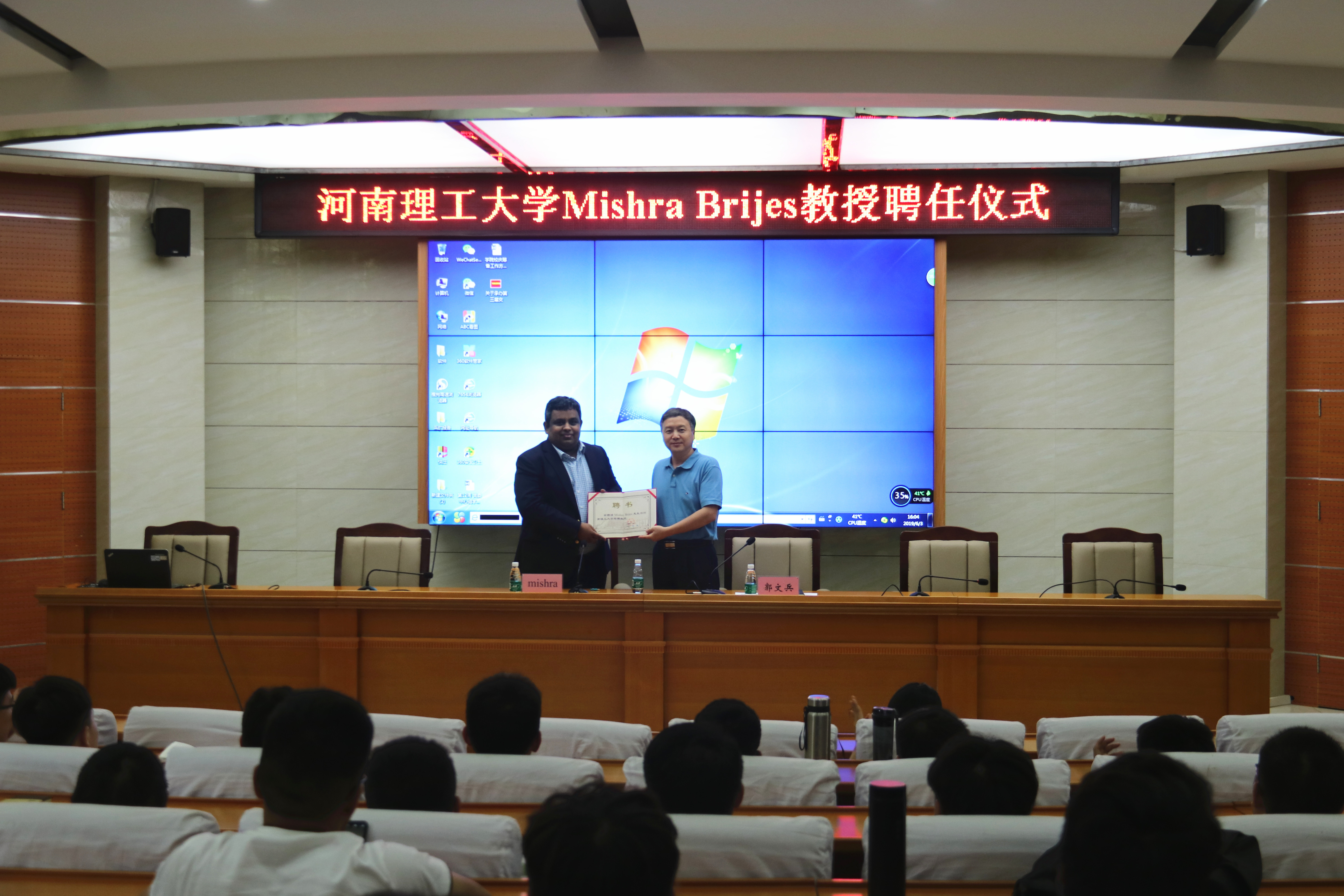 6月4日,黑料718 在104学术报告厅举行美国西弗吉尼亚大学Mishra Brijes特聘教授聘任仪式。院长郭文兵教授主持并为Mishra教授颁发了聘任证书。