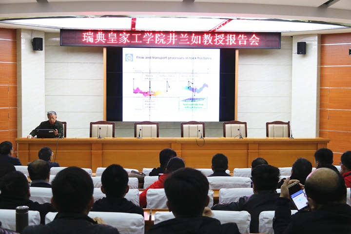 报告会上,井兰如介绍了裂隙岩石渗流的背景、岩石裂隙粗糙度对渗流的诱因和影响规律,并对有效渗流率、裂隙矩阵系统中溶质迁移和两种传统的交叉裂缝混合模型进行详细阐述,构建了可真实反映裂隙岩石渗流和溶质迁移的模型。会后,井兰如对现场师生们所提出的问题进行了答疑,现场学术氛围浓厚。此次交流促进了相关专业师生的学术研究,提升了师生们的科研视野。