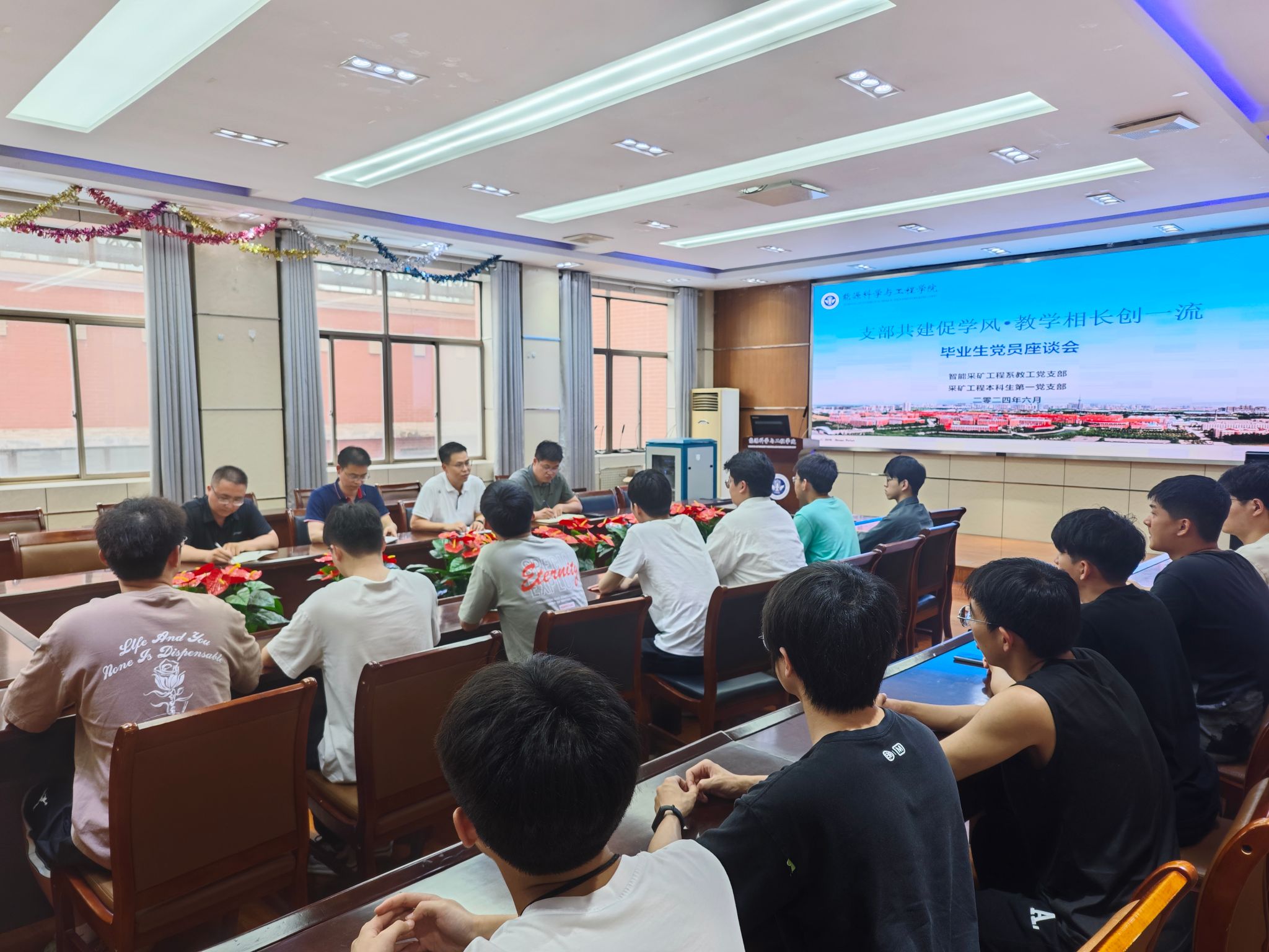6月16日,智能采矿系党支部和采矿工程本科生第一党支部开展“支部共建促学风•教学相长创一流”共创共建暨毕业生党员代表座谈会主题党日活动。本次活动由智能采矿系党支部书记杜锋主持,智能采矿工程系教工党支部部分教师参加了座谈会。